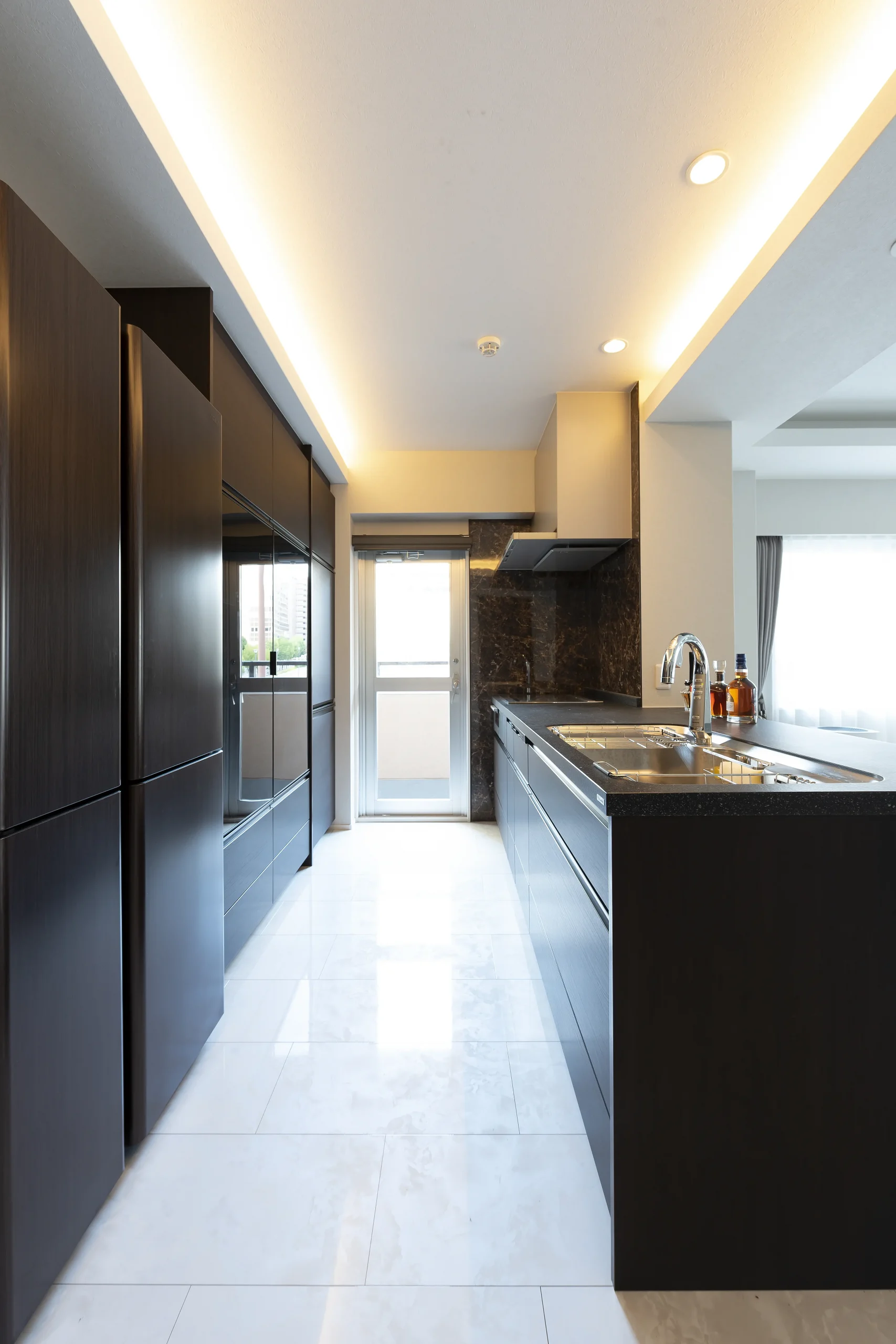 生活感を極力排除した、ホテルライクな空間を目指して設計されたキッチン事例です。白を基調としたカラースキームの中、冷蔵庫などの家電類は、すべて扉で隠しました。