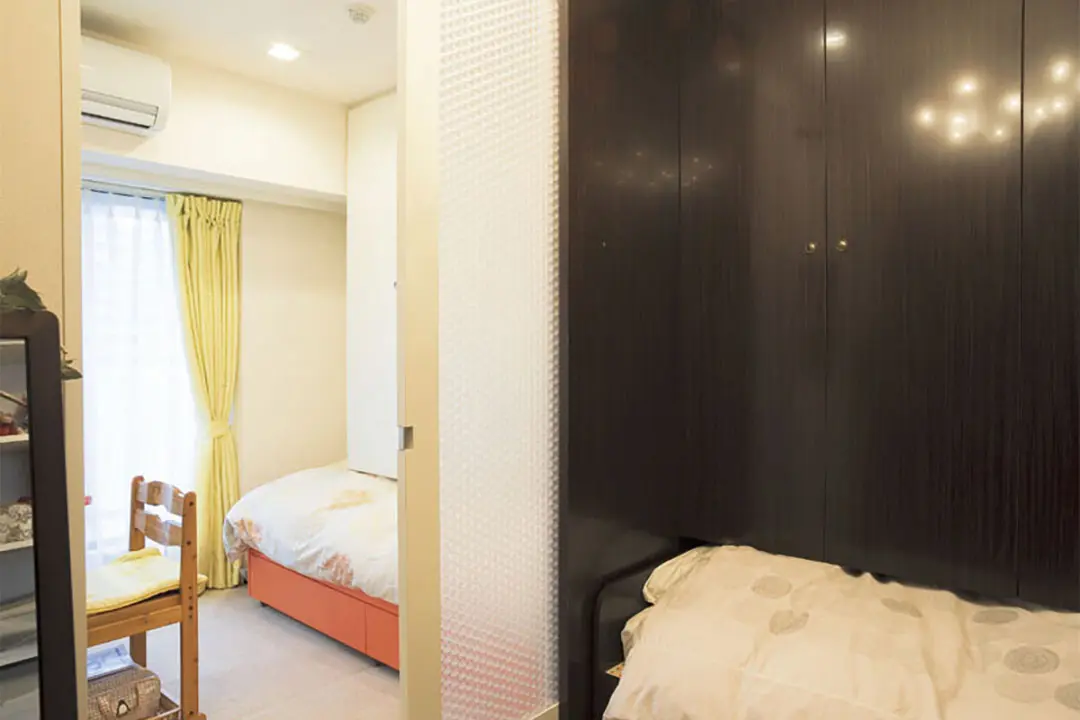部屋が狭く、ベッドが置けないときは収納タイプのベッドを使う手も。スライド式なら、出し入れもラクラクです。