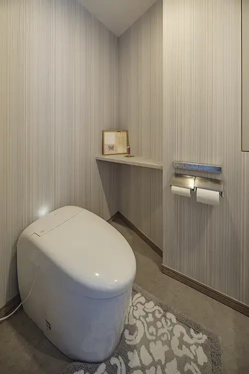 ランドリーエリアでは、洗濯機を隠すロールスクリーンの他、他の部屋とは異なる壁紙を用いることで、本来は生活感のある場所であっても、美しい設えを保とうとする意識が生まれます。