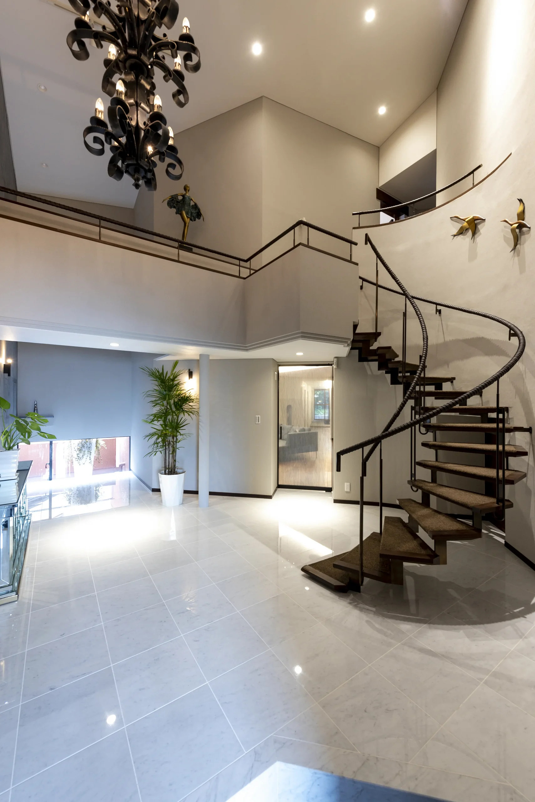 エントランスホールから螺旋階段を上ったところから見たエントランスホール吹き抜け空間。華やかなシャンデリアが天然石シートを優しく照らします。