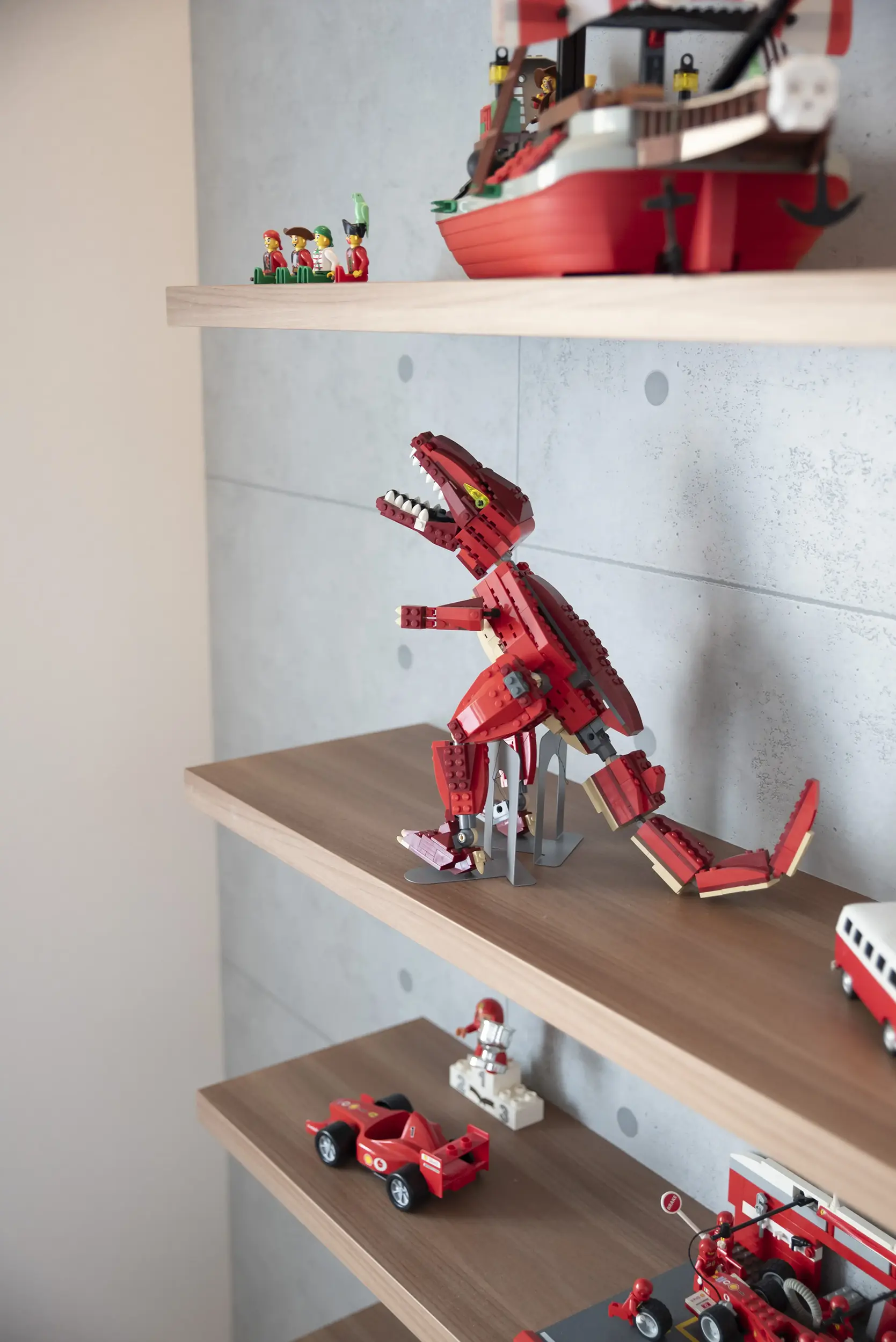 リビングの飾り棚には、幼少期の息子様がつくった模型や玩具を、思い出と一緒に並べています。 -