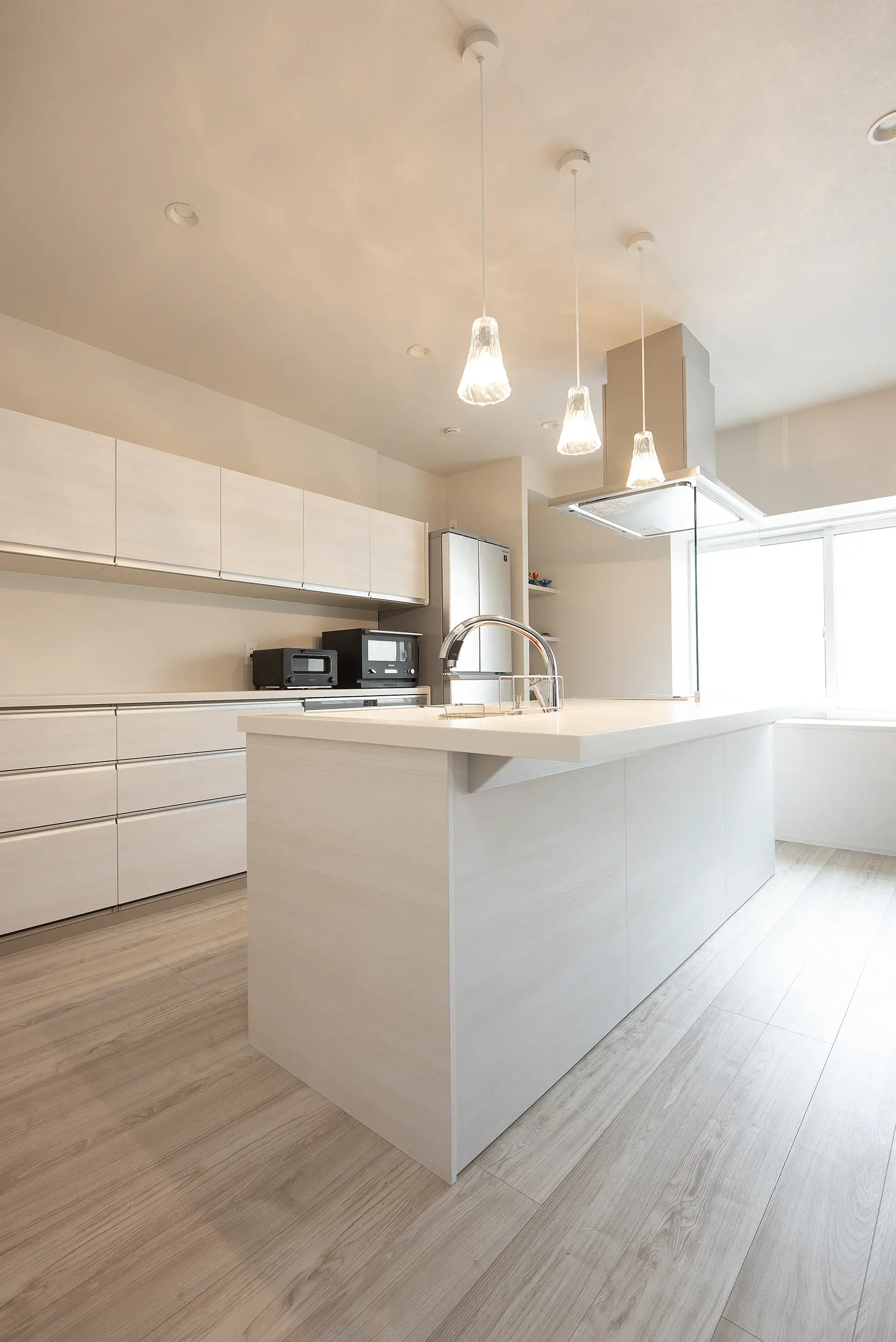 リビングダイニングを可能な限り広くとるため、コンパクトに配置した、シンプルなデザインのアイランド型キッチンです。