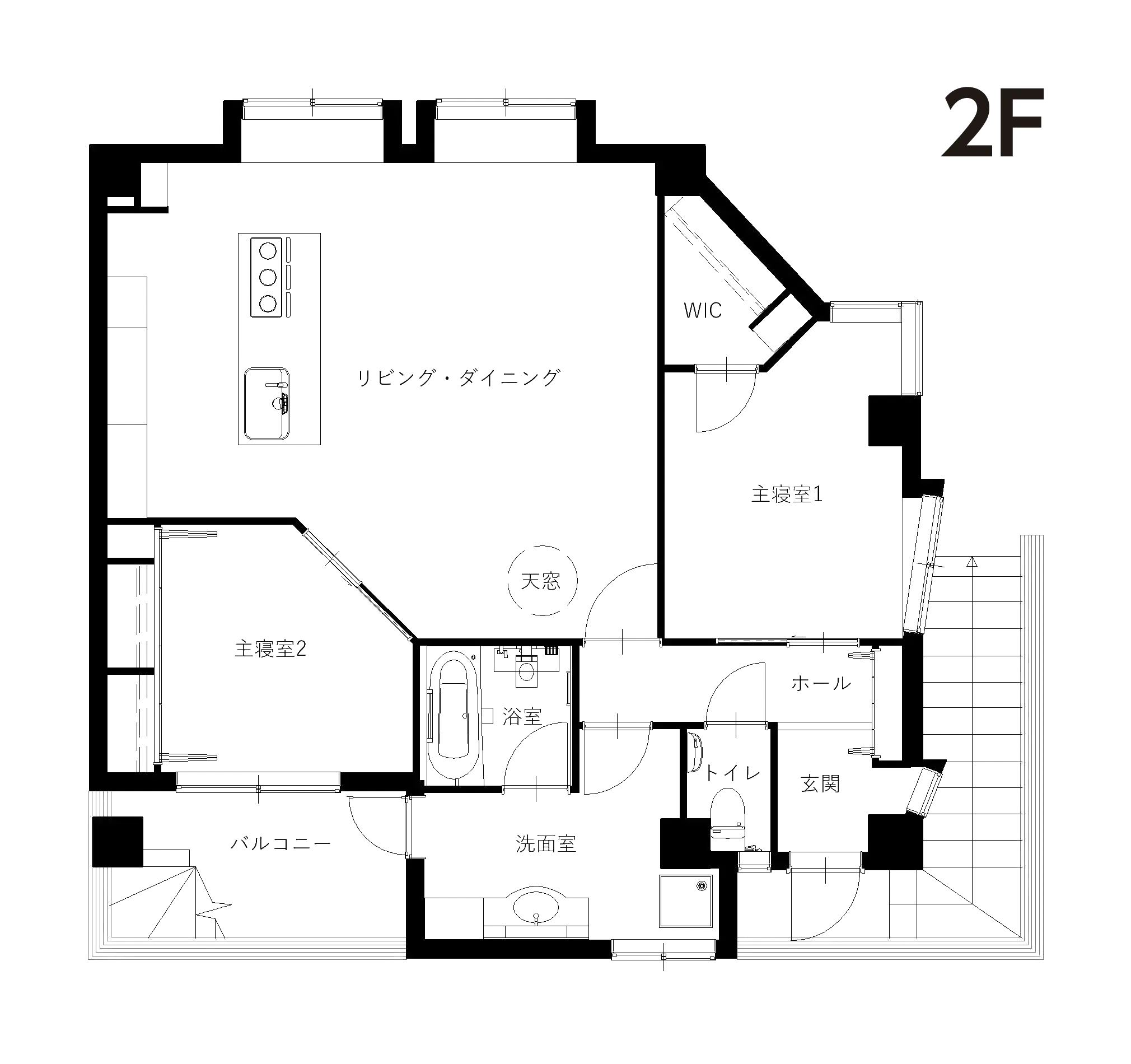 特徴的な部屋の形状は、過去に和室や押入れだったスペースをひとつにまとめたなごりです。ひとつの空間となることで、使用用途が広がりました。左側にはご主人様専用の大きなWICを設けました。