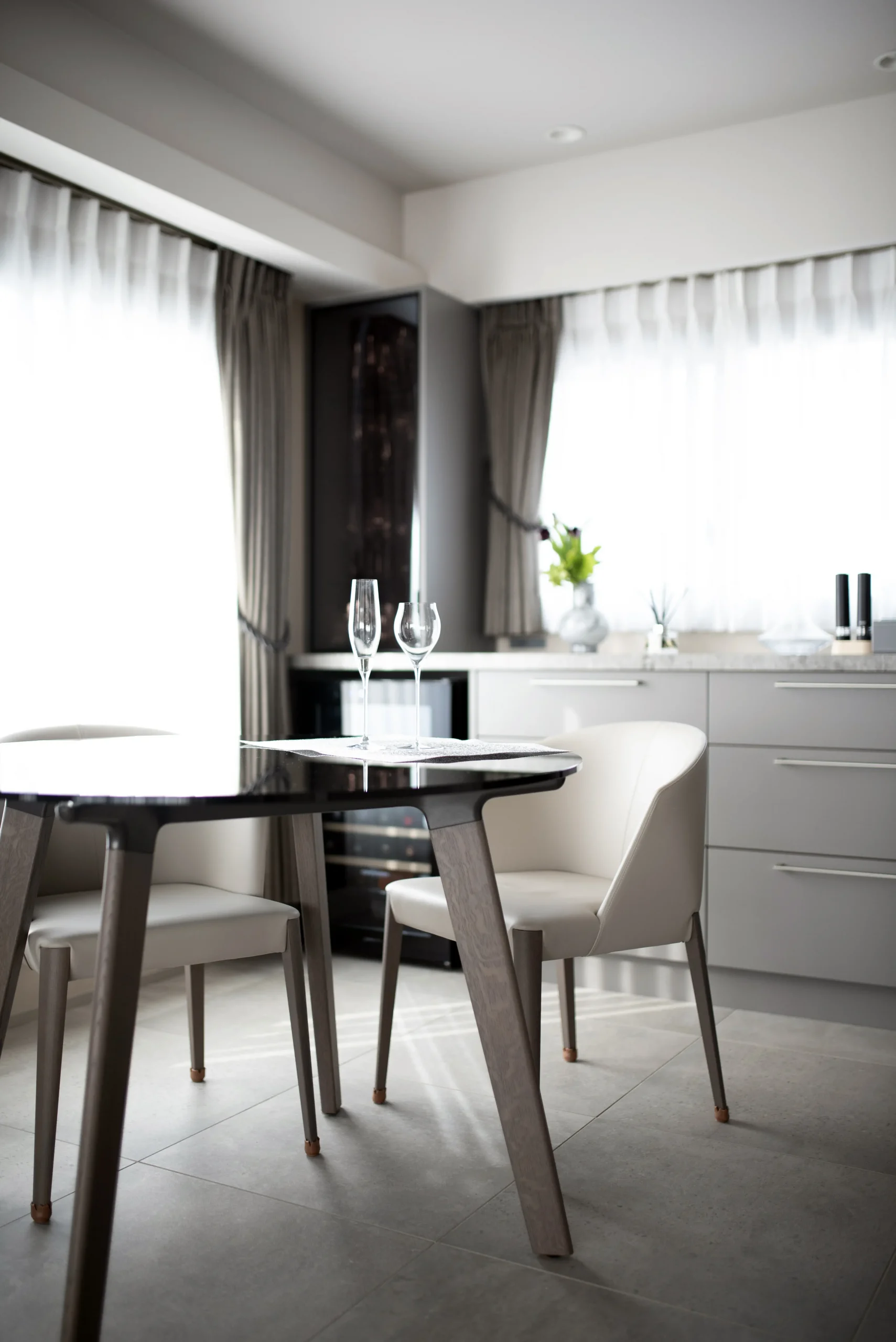 食事を楽しむテーブルと椅子は、内装に合わせて新調しました。キッチンと連続したカウンターキャビネット。キャビネットの一部にワインセラーを設置、カウンター上にはワイングラスを飾る飾り棚を設えました。