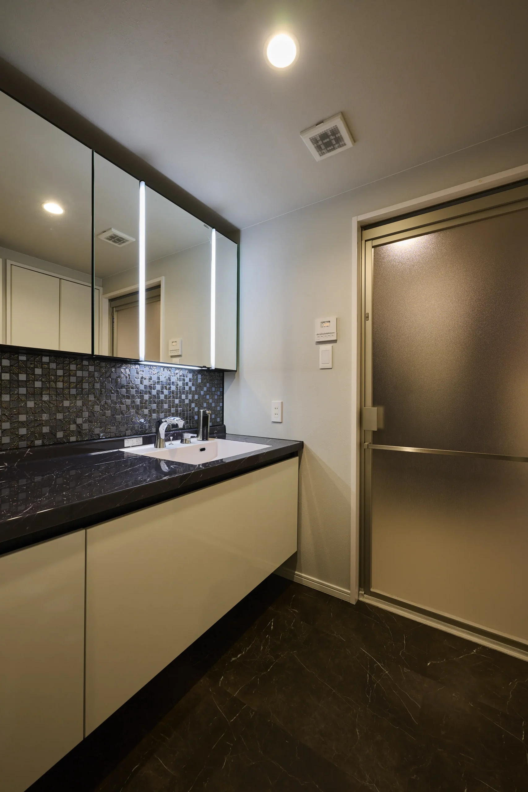 洗面台のカウンターの幅は1m50cmのゆったりサイズ。カウンターの奥の壁には黒の光沢のあるモザイクタイルを貼りました。洗面ボールの上部は、顔や手元が見やすいように、縦ラインの照明がついています。