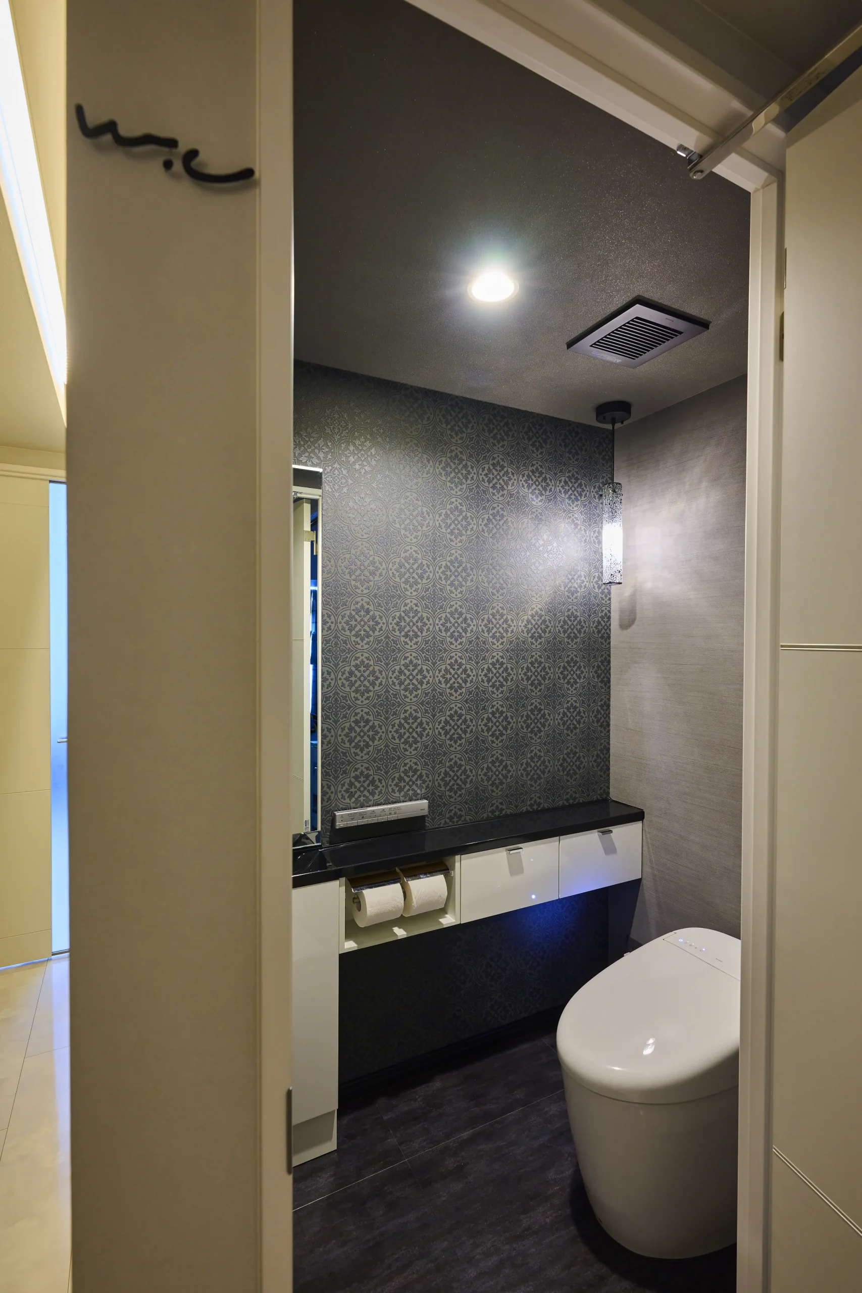 トイレには、ご要望のあったペンダント照明を設え、黒の壁に光の美しいシルエットが映し出されています。