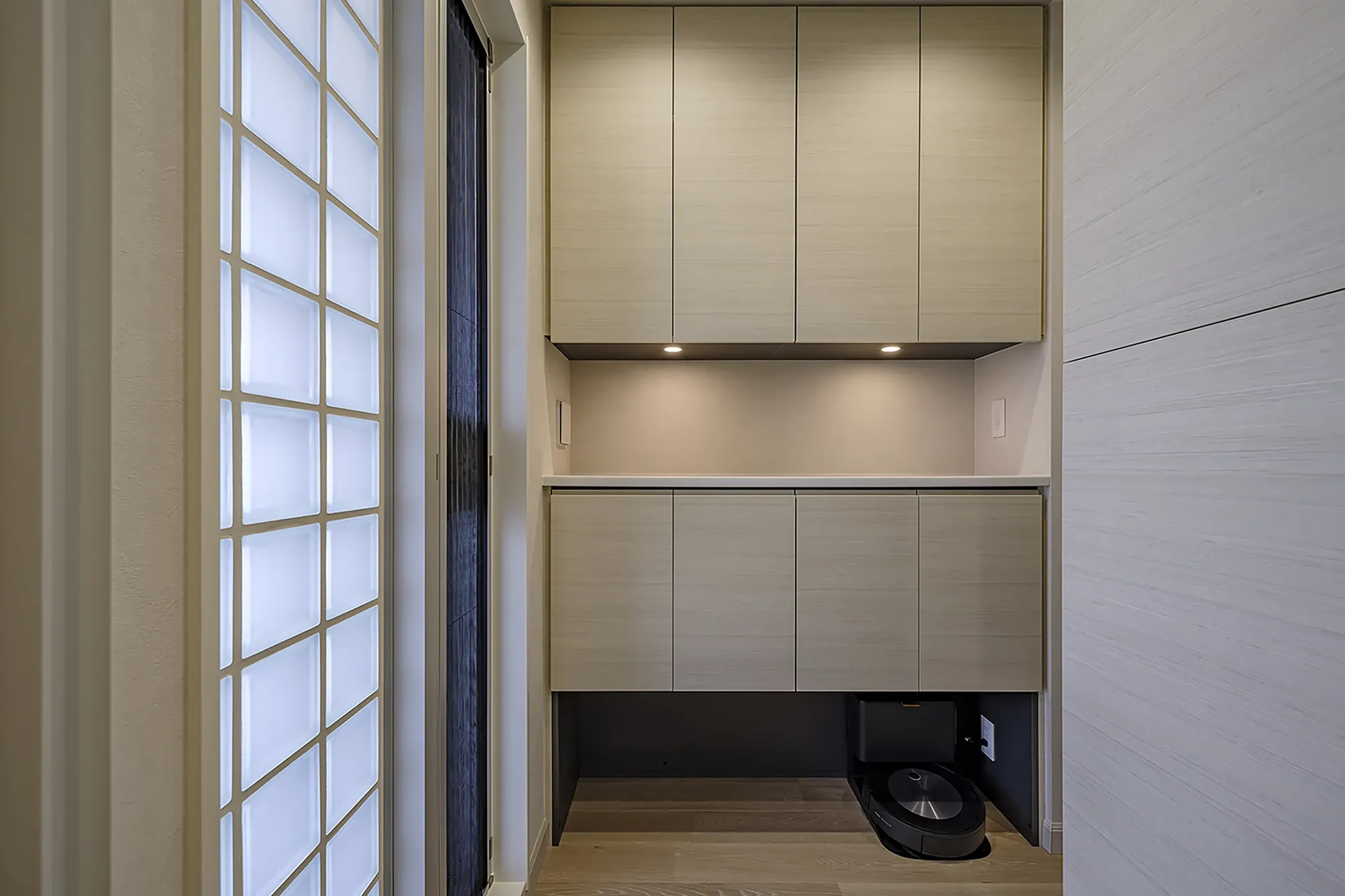 築18年の長く住まわれた愛着のあるマンションを、より快適に生活できる空間へリノベーションしたいというお施主様の思いから計画がスタートしました。全体的に既存の間取りは活かしながら、物置きになっていた洋室の1つを、ウォークインクローゼットと、玄関ホールを拡張したようなスペースへと作り変えています。このスペースは、シューズクローゼットの他、ペット用のトイレや、趣味のワインセラーをはじめとする収納機能を充実させることで、他のLDKや寝室の空間がより広々と使えるようになっています。また、空間全体にわたって柔らかい色合いの白やグレージュ系のカラー、木の仕上げを用いて、シンプルながらも温かみのあるインテリアとなっています。