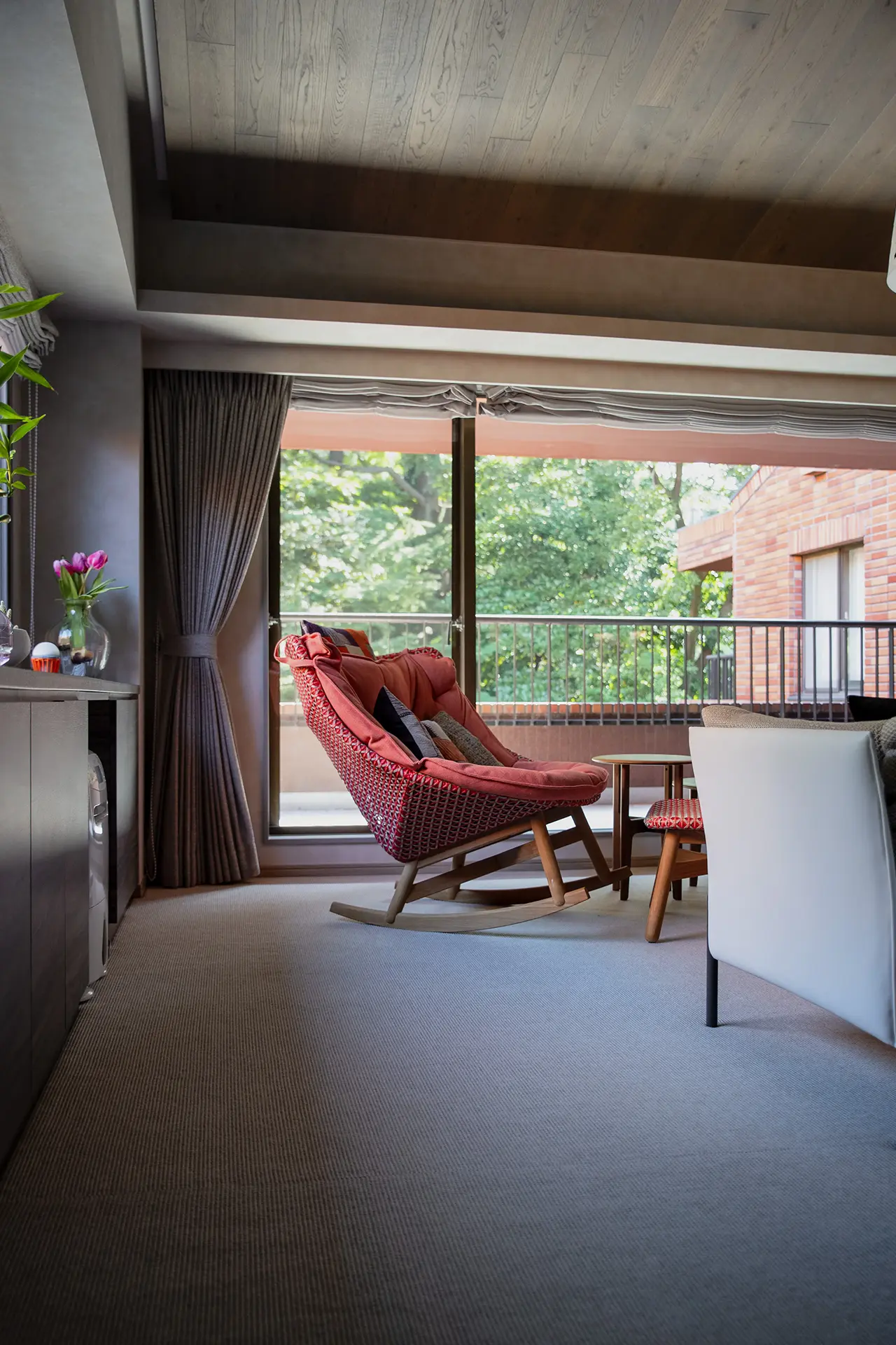 リビング/ダイニング天井には天然木単板を貼り込んだ特注色のパネルを用い、間接照明と合わせることで、空間の高さを強調しながらもインテリアとの調和を生み出すようにコーディネートしました。リビングからの眺望を意識して高さを抑えた家具や、LDKのどこに居ても緑を感じる事ができる仕掛けを要所に散りばめた心地良い空間が広がります。