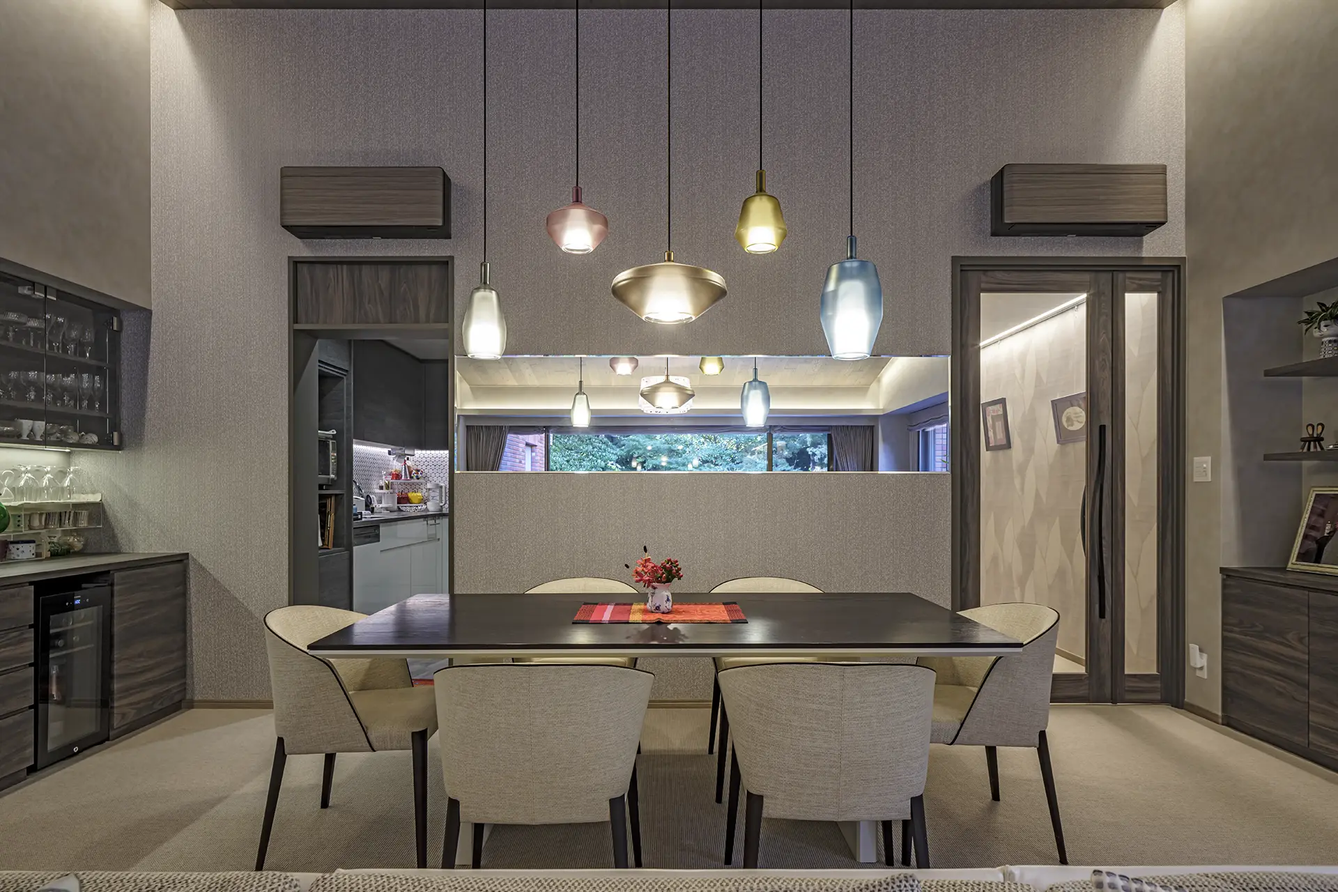 ダイニングダイニングには木々の緑が映り込む横長ミラーを中心に両側の建具は高さを揃え、意匠性に優れた壁かけエアコンを配置しています。色とりどりの5灯のペンダント照明はイタリア製 PENTA MOMのもの。高さを変えることで楽しさを演出しています。