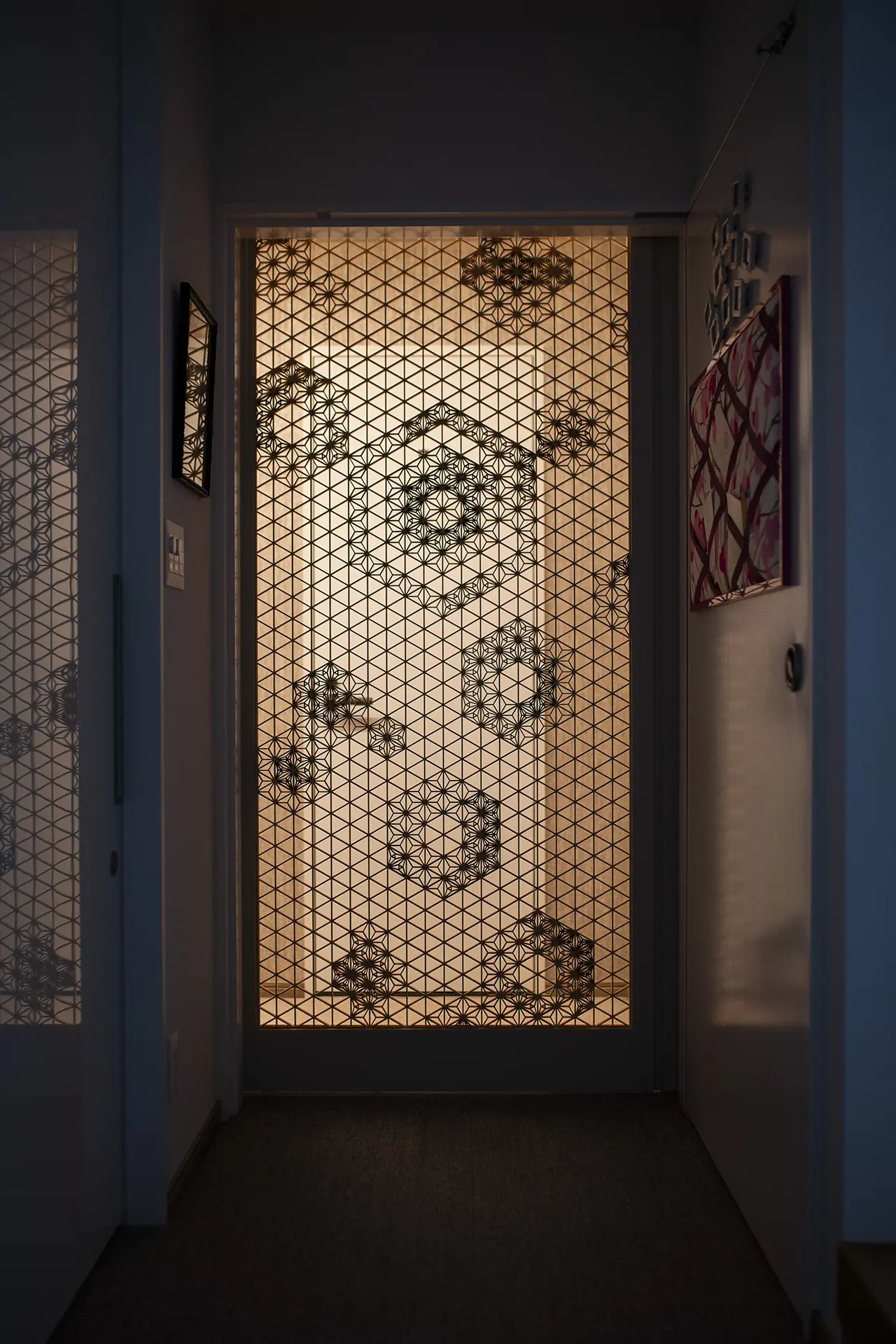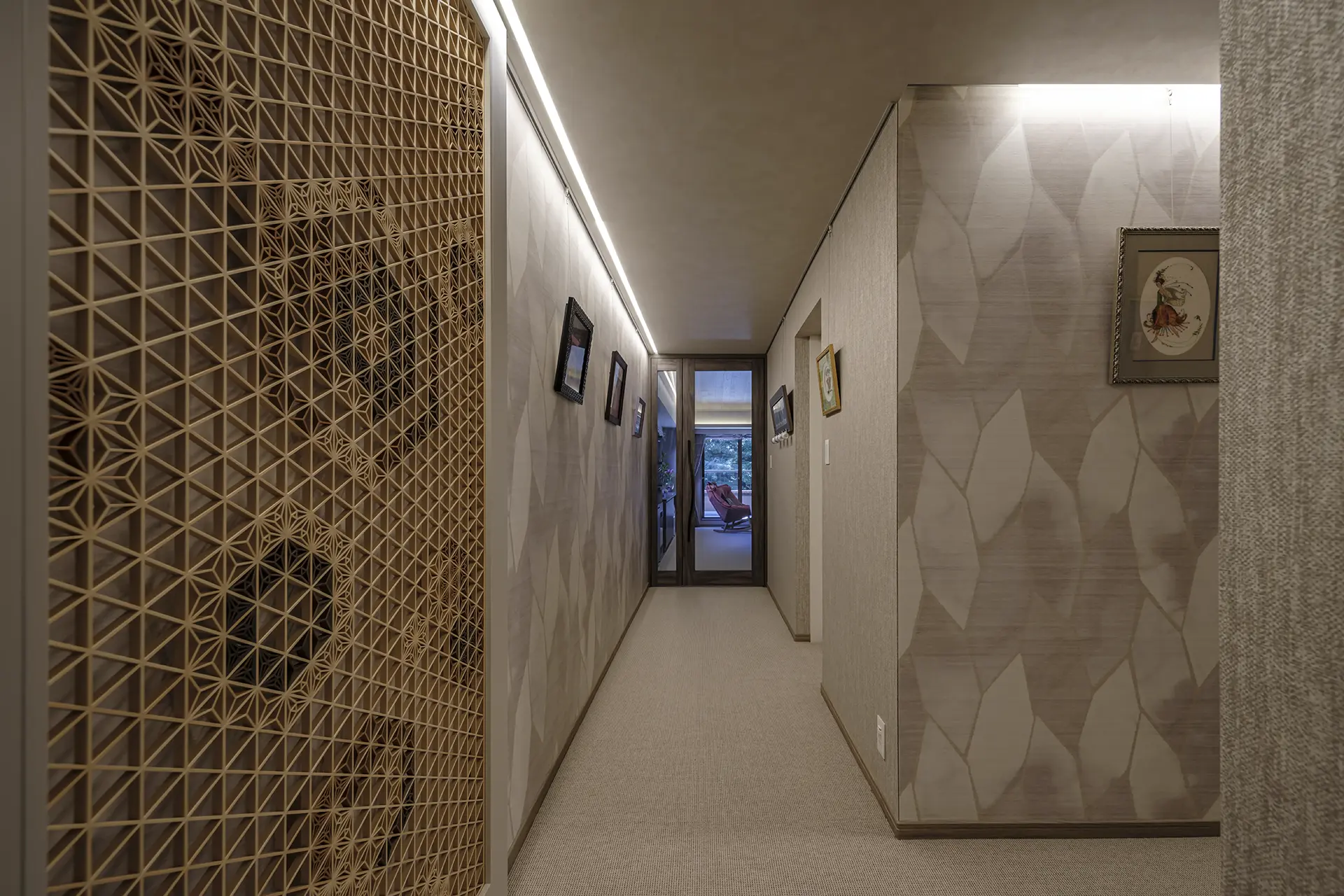 廊下ギャラリー空間の先には、組子細工の引き戸を設けてパブリックとプライベートの空間を柔らかくゾーンニングしています。組子にもペンタゴンのデザインを採用し、廊下の壁紙とリンクさせました。L型のギャラリー空間は季節に合った額装で飾られ、都会にありながら木々の緑に囲まれた癒しのリビング空間へとつながります。