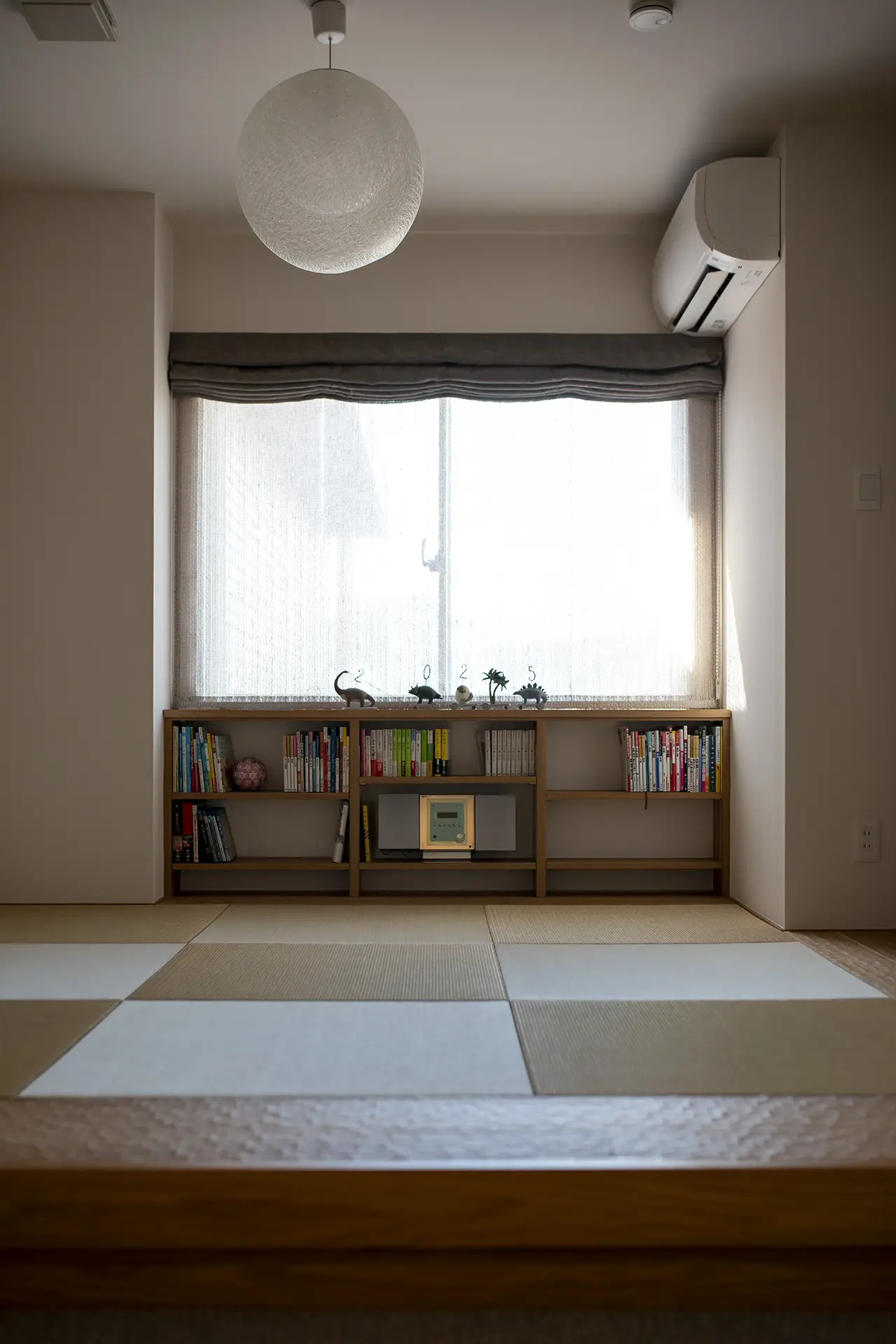 和室/ゲストルーム小上がりの畳は縁無しを採用し、なぐり加工で仕上げた木製框を設えました。通路スペースとは区切らずオープンな空間とし、ゲストルームとは三枚の引き戸で仕切りました。照明はどちらの空間にも合う伊藤豊雄氏のMAYUHANA。組子の建具との相性も良く広く開放的な空間となっています。