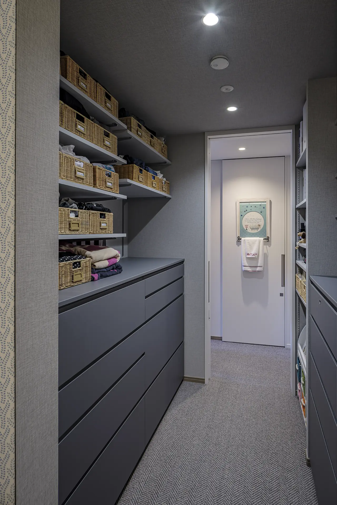 機能的な収納は取手などが極力目立たない様にデザイン。寝室からバスルームへ通じる通路には、お施主様がお持ちの小物に合わせてサイズを調整した造作収納が設けられています。また、洗面室やトイレでは、シンプルながらも表情豊かなタイル、印象的な色合いのクロス、個性的なミラーなどを用いて、空間の快適性とインテリアの遊び心を両立させました。