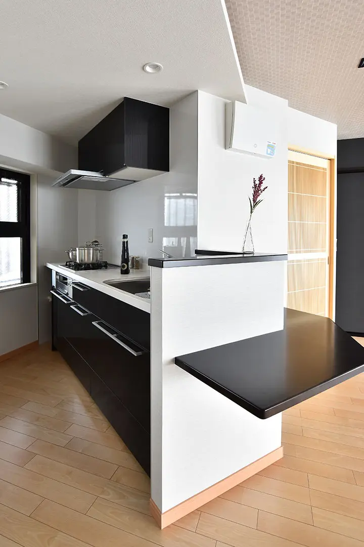 洋室1部屋分が広くなったLDK。生徒様方とお琴を楽しまれるだけではなくキッチンスペースにも配慮をされました。キッチンには今まで複数名が立てるスペースがありませんでしたが、今回、キッチンのレイアウトを変え、さらに間口を広くとったことで、開放感のあるキッチンスペースに。生徒様同士のコミュニケーションを楽しめる空間へ生まれ変わりました。